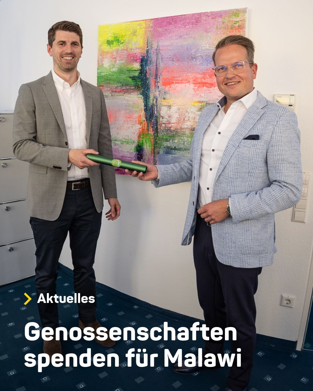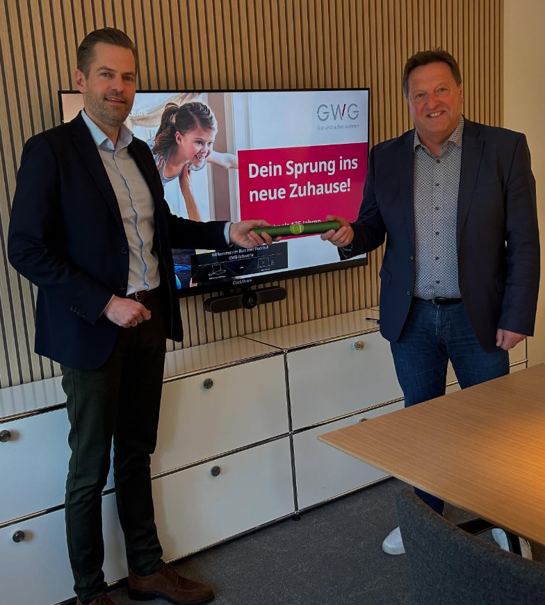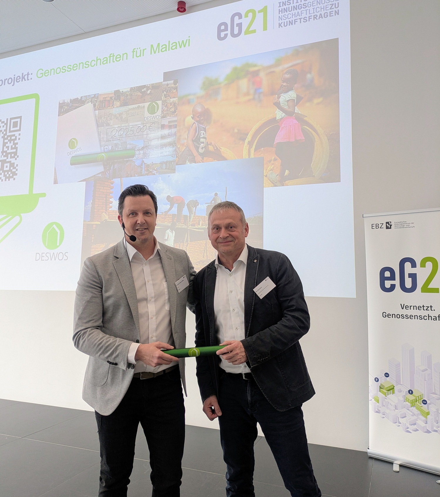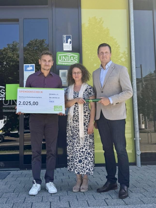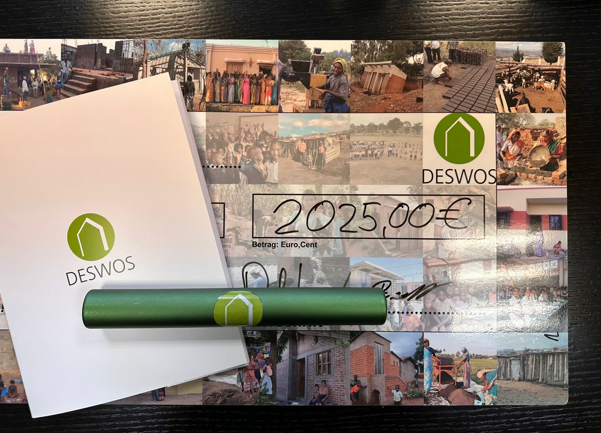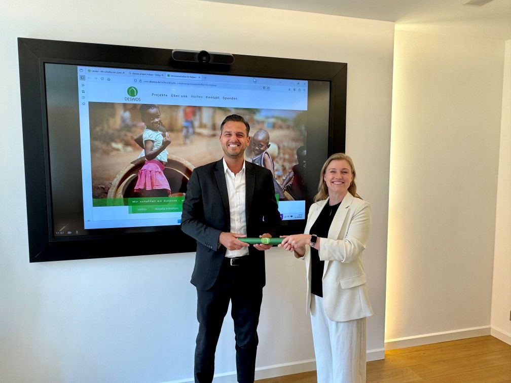 Zum Auftakt der Spendenaktion „Genossenschaften für Malawi“ überreichten Laureen Brandt und Dr. David Wilde von der hwg eG eine erste Spende in Höhe von 2025,- Euro an die DESWOS. Und einen Staffelstab, der in den nächsten Wochen und Monaten an weitere Wohnungsgenossenschaften in Deutschland und der Schweiz weitergegeben wird, die sich an der Spendenaktion beteiligen möchten.