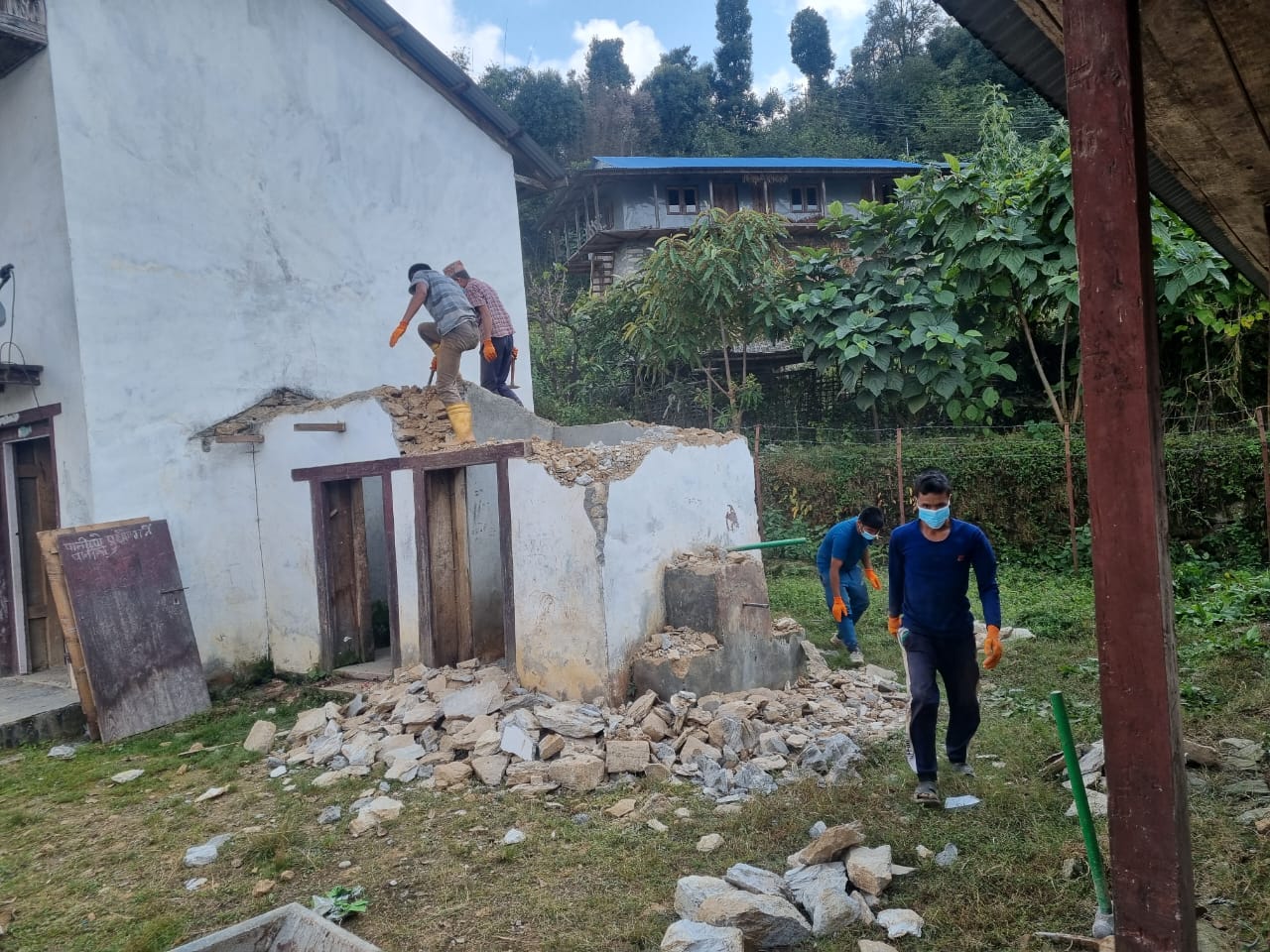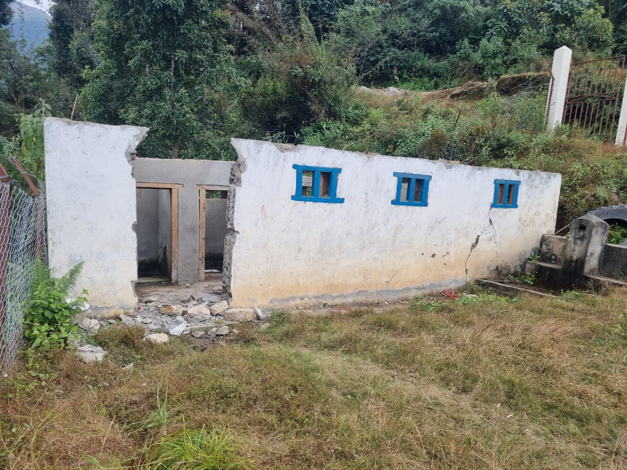 Die Schäden, die der letzte starke Monsunregen in Nepal im Jahr 2023 verursacht hat, sind im Himalaya-Bergdorf Gope noch zu erkennen. Die Toiletten der örtlichen Gesamtschule sind teilweise abgerutscht und mit großen Rissen durchzogen, die Nutzung für die 400 Schulkinder sehr bedenklich. Auch die Versorgung mit Trinkwasser für die Schule und die Menschen in umliegenden Dörfern wurden dabei zerstört.